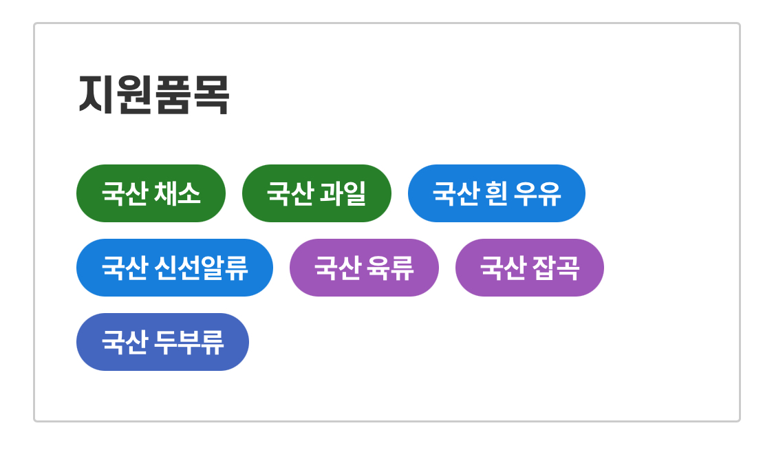 - 국산 과일, 채소, 우유, 현미, 계란, 두부, 고기 등 신선식품
