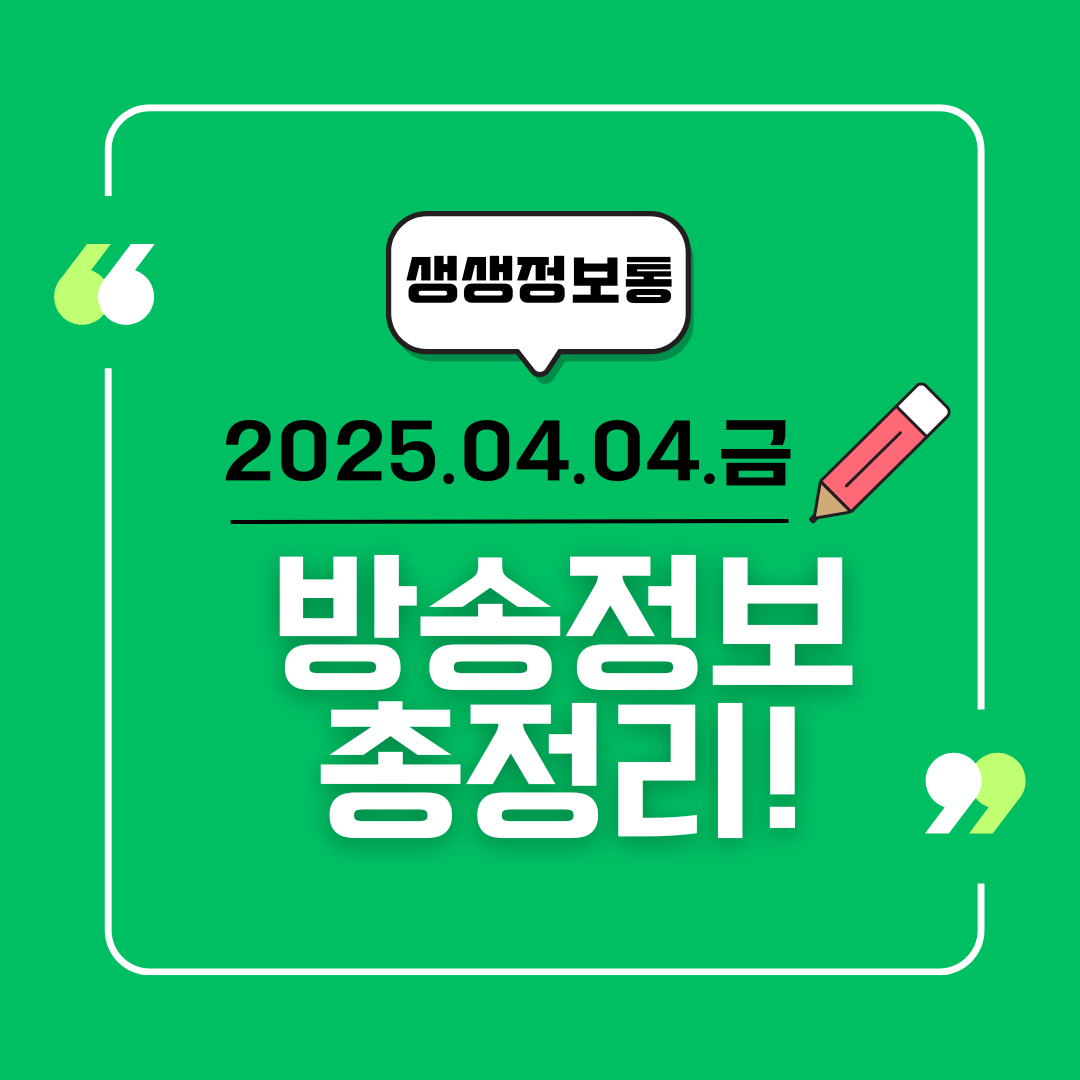 | [2TV 생생정보 2265회] 4월 7일 월요일 방송 정보 총정리! (0) | 2025.04.07 |