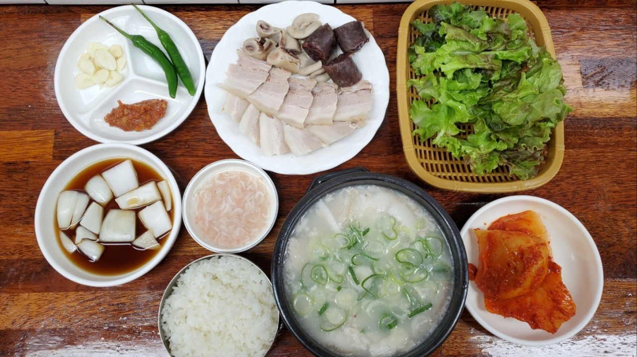 - 사이드: 깍두기, 새우젓, 생양파, 고추, 간장양파절임