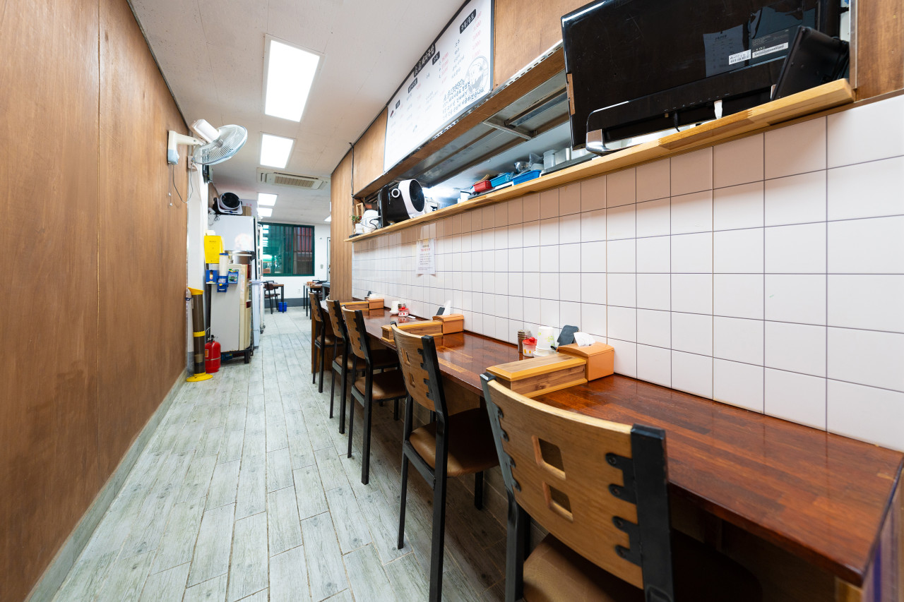벽면 한쪽엔 바 좌석도 있어 혼밥하러 온 손님도 부담 없이 앉을 수 있는 구조가 인상적이예요. 무엇보다 24시간 우려낸 국내산 돼지사골 국물이라는 안내 문구에서 이 집의 자신감이 느껴지네요.