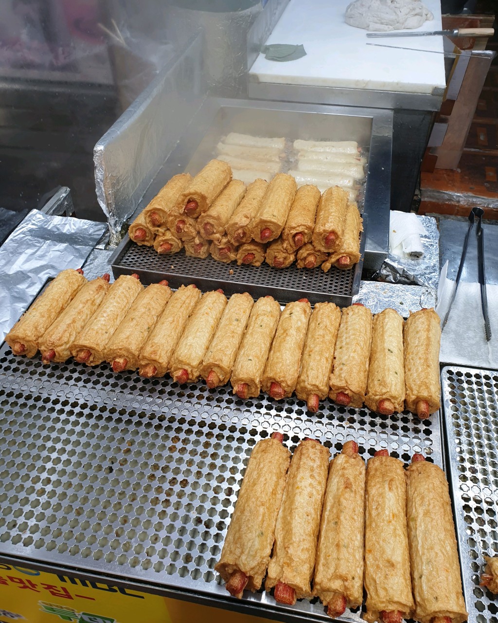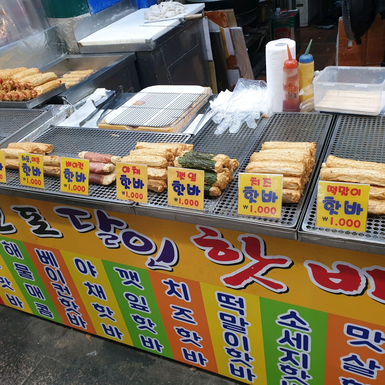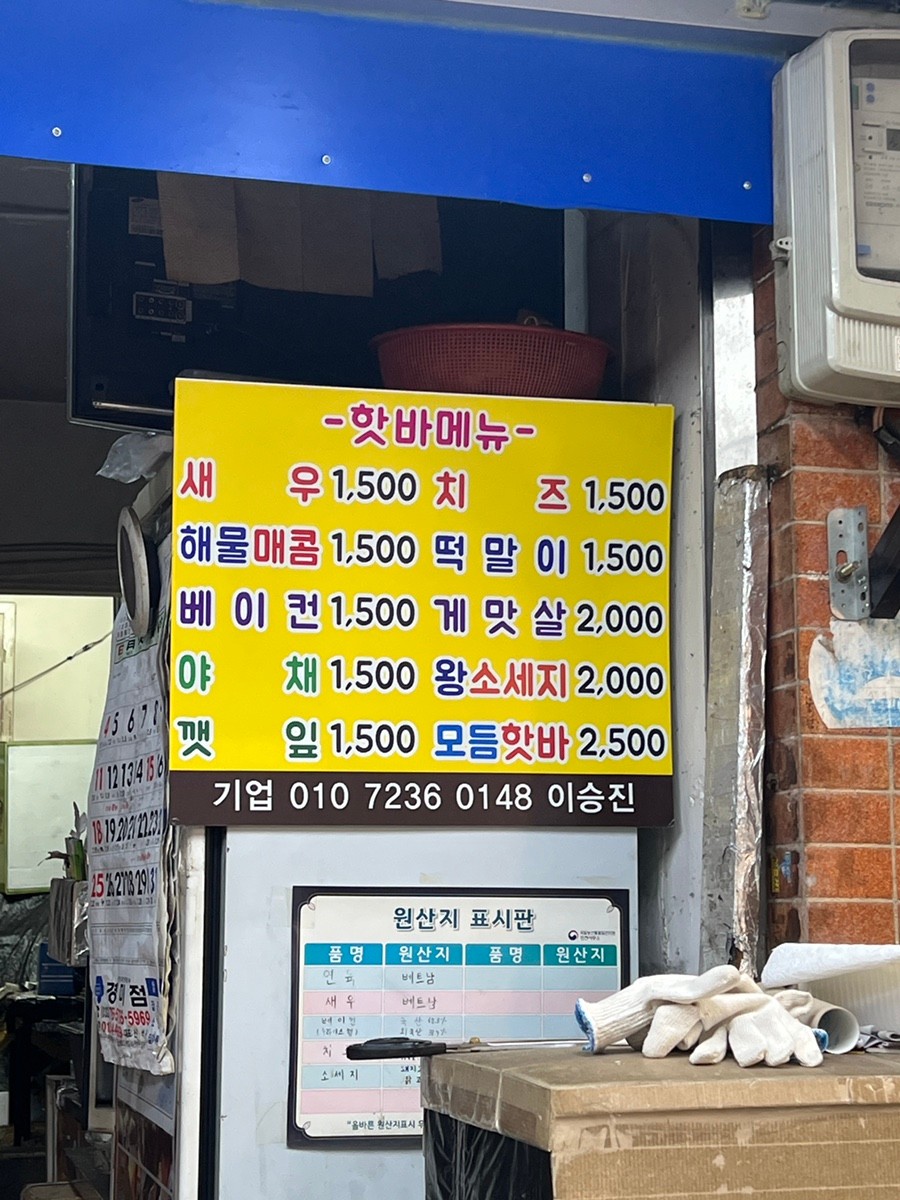 외관은 전형적인 시장형 노점처럼 보이지만, 노란 간판과 끊임없이 튀겨지는 핫바 덕분에 멀리서도 단번에 눈에 띄어요. 내부라고 부르기보다는 오픈형 조리 공간이라, 조리 과정을 바로 볼 수 있고, 고소한 냄새가 시장 안을 가득 채우는 곳이에요. 튀김기 옆으로 손님 줄이 길게 이어지는데도 다들 웃으며 기다리는 모습이 인상 깊습니다.