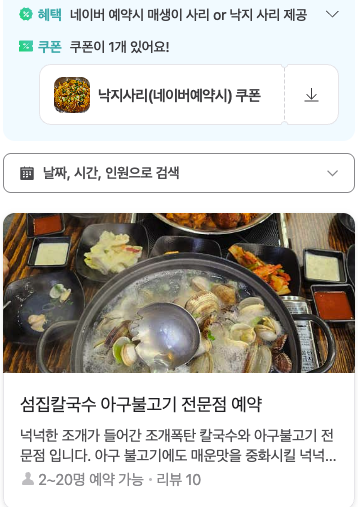 네이버 플레이스에서 예약하면 낙지사리를 서비스로 받을수 있어요.
