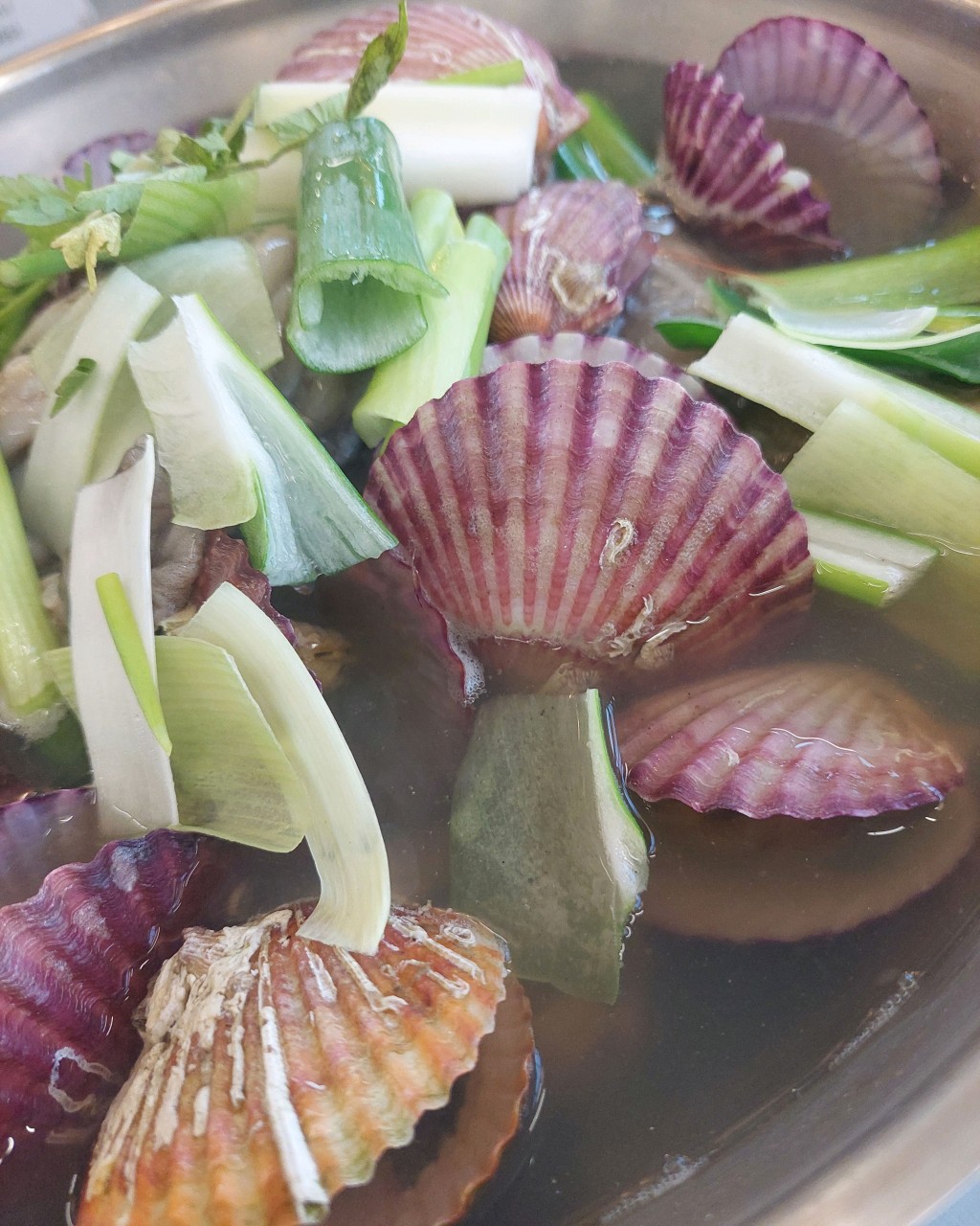 여기선 대표 메뉴인 아구불고기가 제일 유명한데요, 소짜 기준 3만 8천 원이었어요. 함께 나오는 서비스 메뉴인 해물전골이 정말 대박이에요. 자연산 조개부터 칼국수 사리, 낙지까지 푸짐하게 들어있어서 메인 요리 못지않은 만족감을 줘요. 저희는 5명이 방문해서 아구불고기 중짜에 조개칼국수를 추가로 주문했는데, 이게 한 상 거하게 차려지더라고요. 특히 조개칼국수 국물은 해산물이 많이 들어가서 그런지 정말 진하고 깊은 맛이 났어요