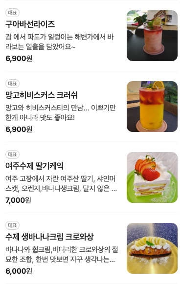 특히 ‘빙수치노’는 여름철 인기메뉴라고 하더라고요!디저트도 직접 제작한 고급 베이커리로 퀄리티가 높아요.