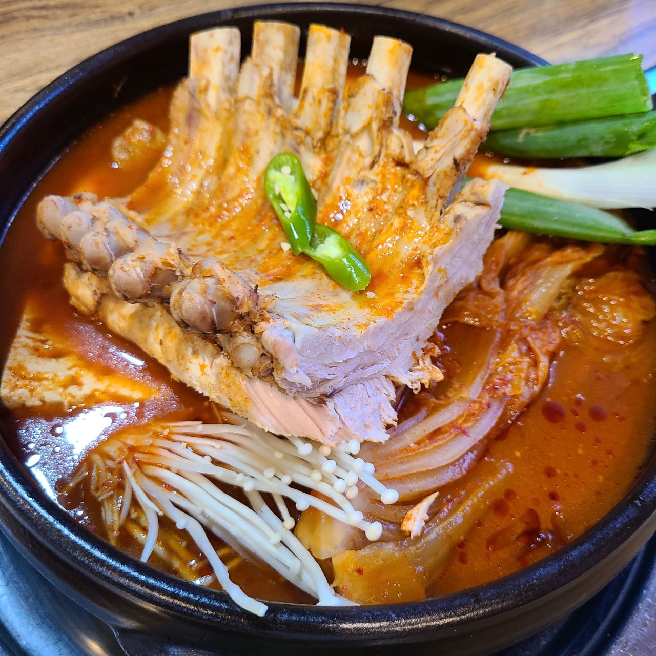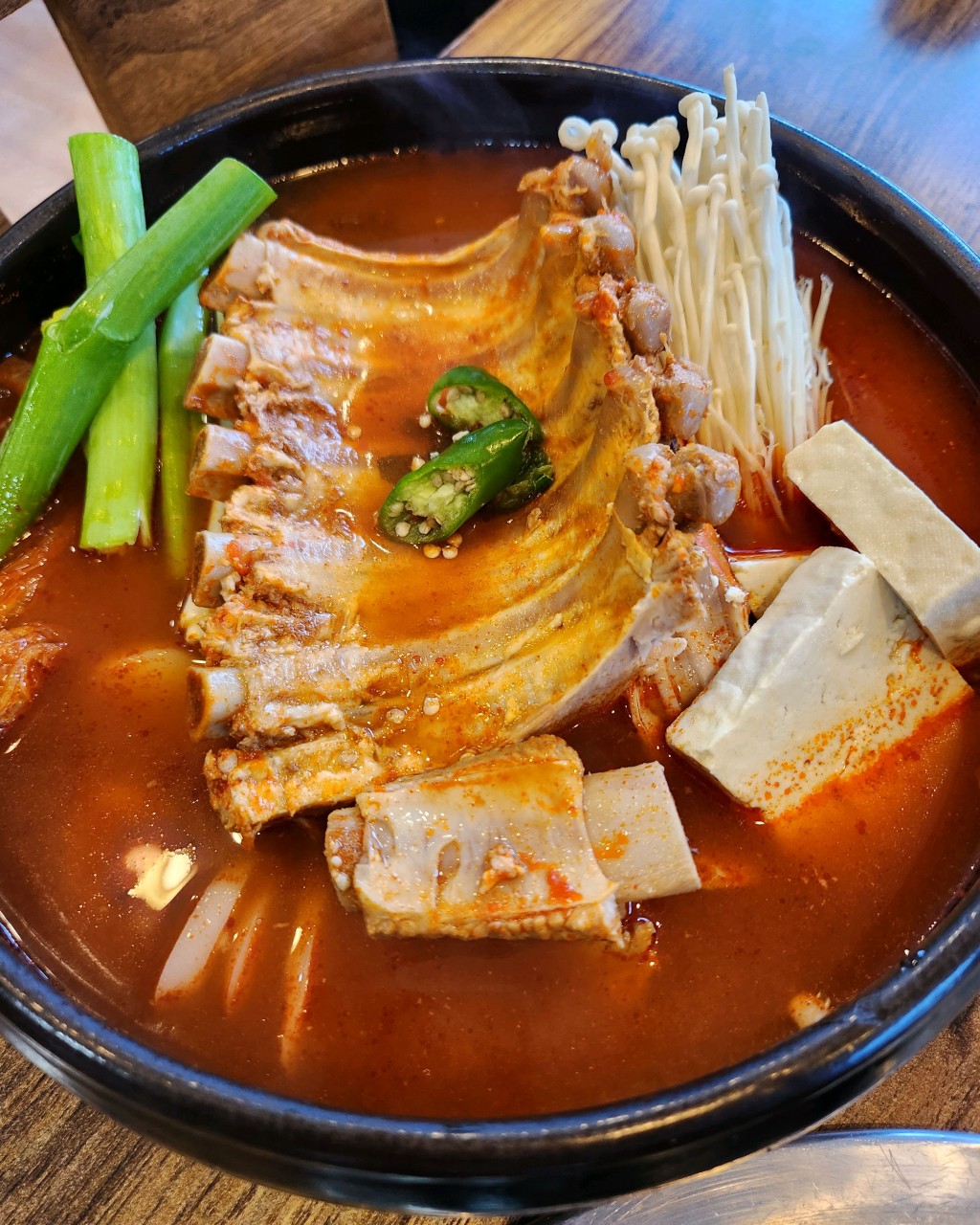 등갈비찜이 등장했을 때 비주얼부터 감탄했어요. 푸짐한 등갈비와 두툼한 묵은지가 듬뿍 담겨 있었고, 국물은 깊고 진했습니다.