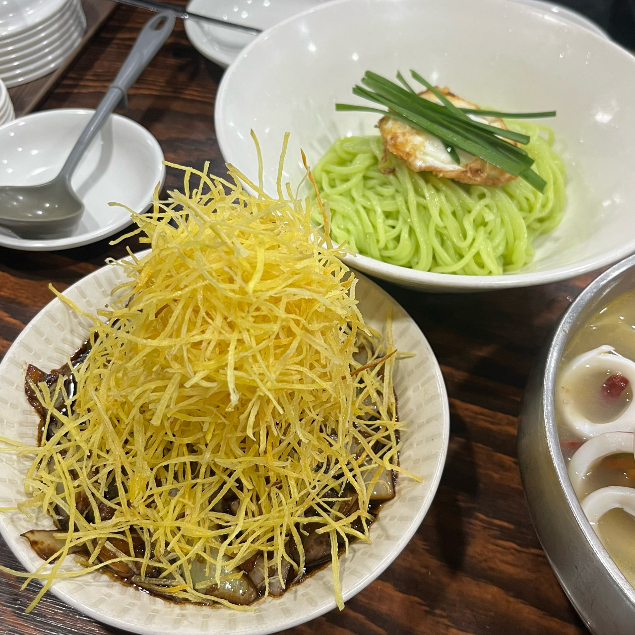 → 고구마채 토핑과 따로 제공되는 짜장 소스 구성 - 백짬뽕 12,000원