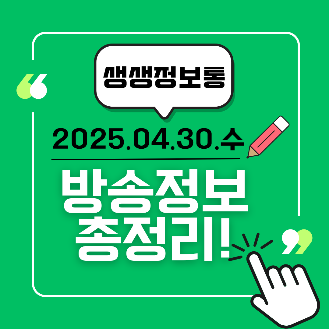 | [2TV 생생정보 2281회] 4월 29일 화요일 방송 정보 총정리! (1) | 2025.04.29 |