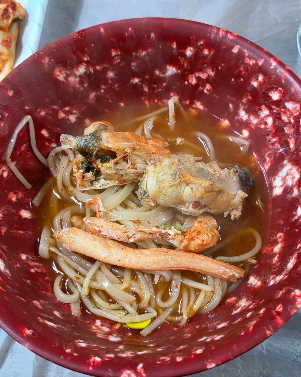 국수 위에 홍게와 각종 해산물이 통째로 올라가며,