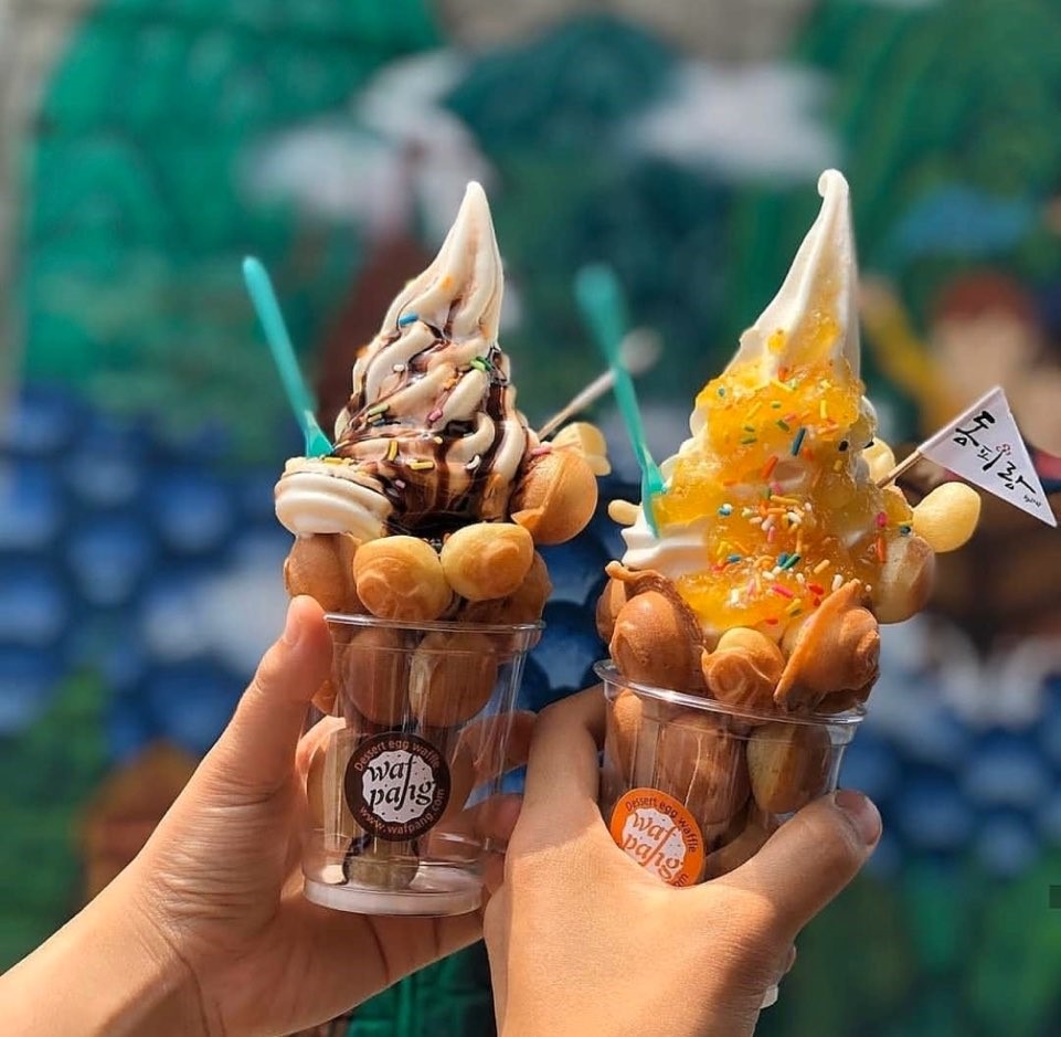 알록달록한 머랭 쿠키와 과일, 생크림이 올라간 홍콩식 와플인데요,