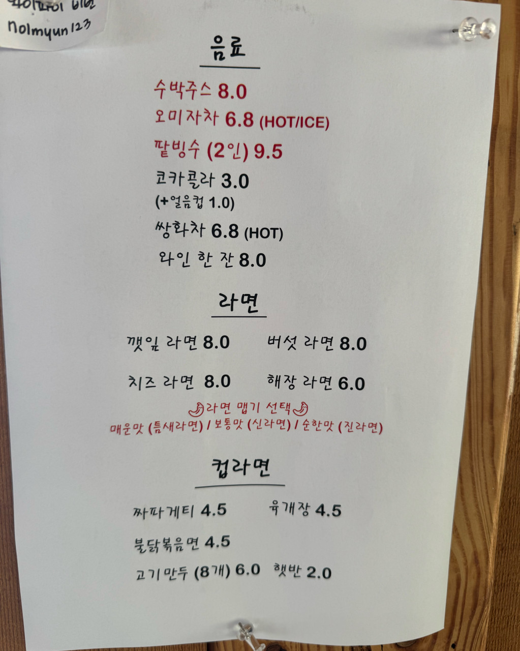 - 깻잎라면(8,000원): 깔끔한 국물과 향긋한 깻잎 조화