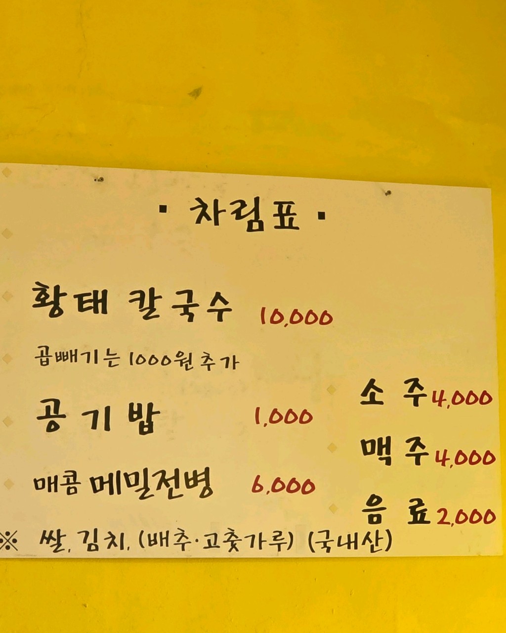 - 황태칼국수는 오전 재료 소진 시 조기 마감 가능성 있음