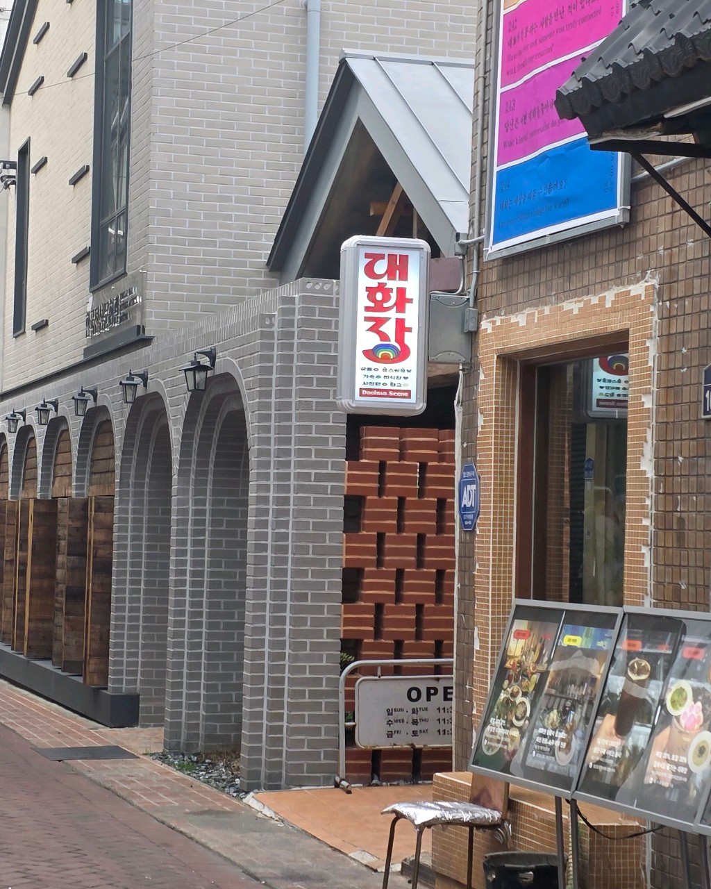 외벽에는 은은한 노란 조명과 함께 ‘대화’라는 간판이 고풍스럽게 자리잡고 있으며,