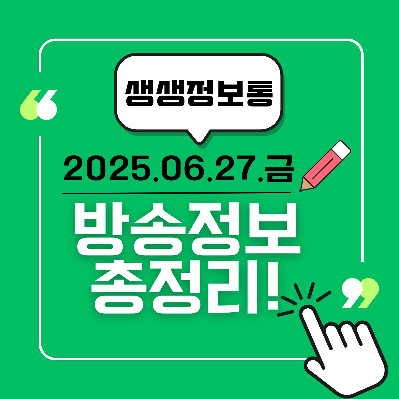 | [2TV 생생정보 2322회] 6월 26일 목요일 방송 정보 총정리 (0) | 2025.06.26 |