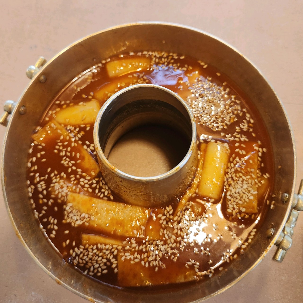 전통 신선로 그릇에 팥, 인절미, 과일 등을 풍성하게 담고