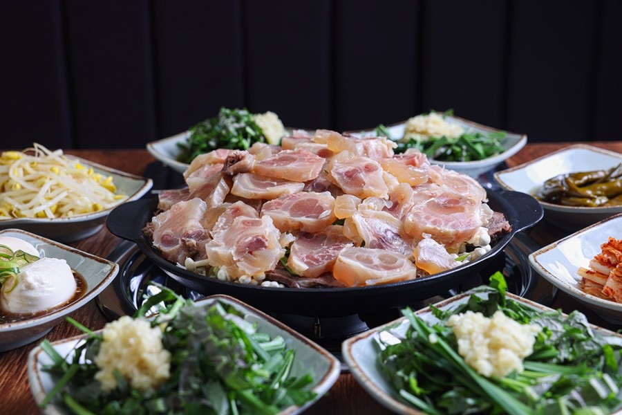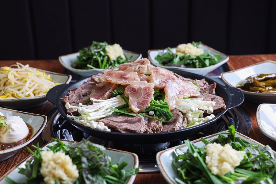 중짜리 기준(3~4인분)은 38,000원으로 제공되며, 수육, 스지(힘줄), 각종 야채가 푸짐하게 담겨 있어 국물과 고기의 조화가 뛰어나다.