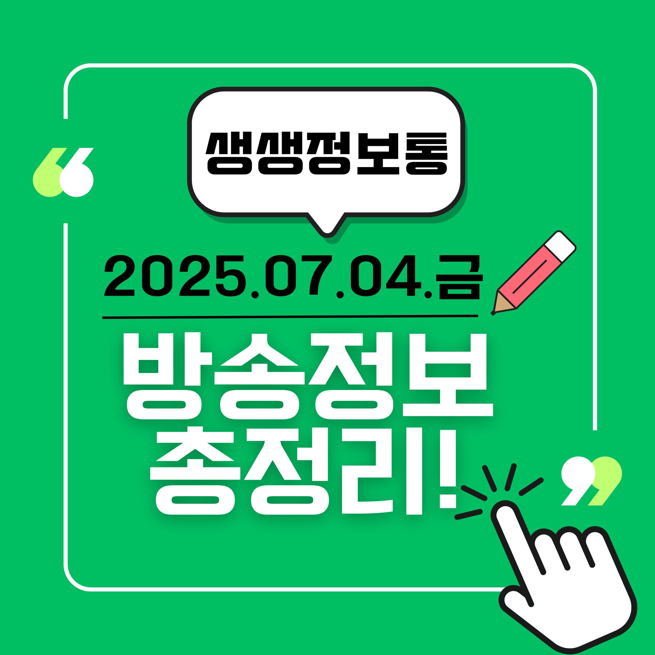 | [2TV 생생정보 2331회] 7월 9일 수요일 방송 정보 총정리 (6) | 2025.07.09 |