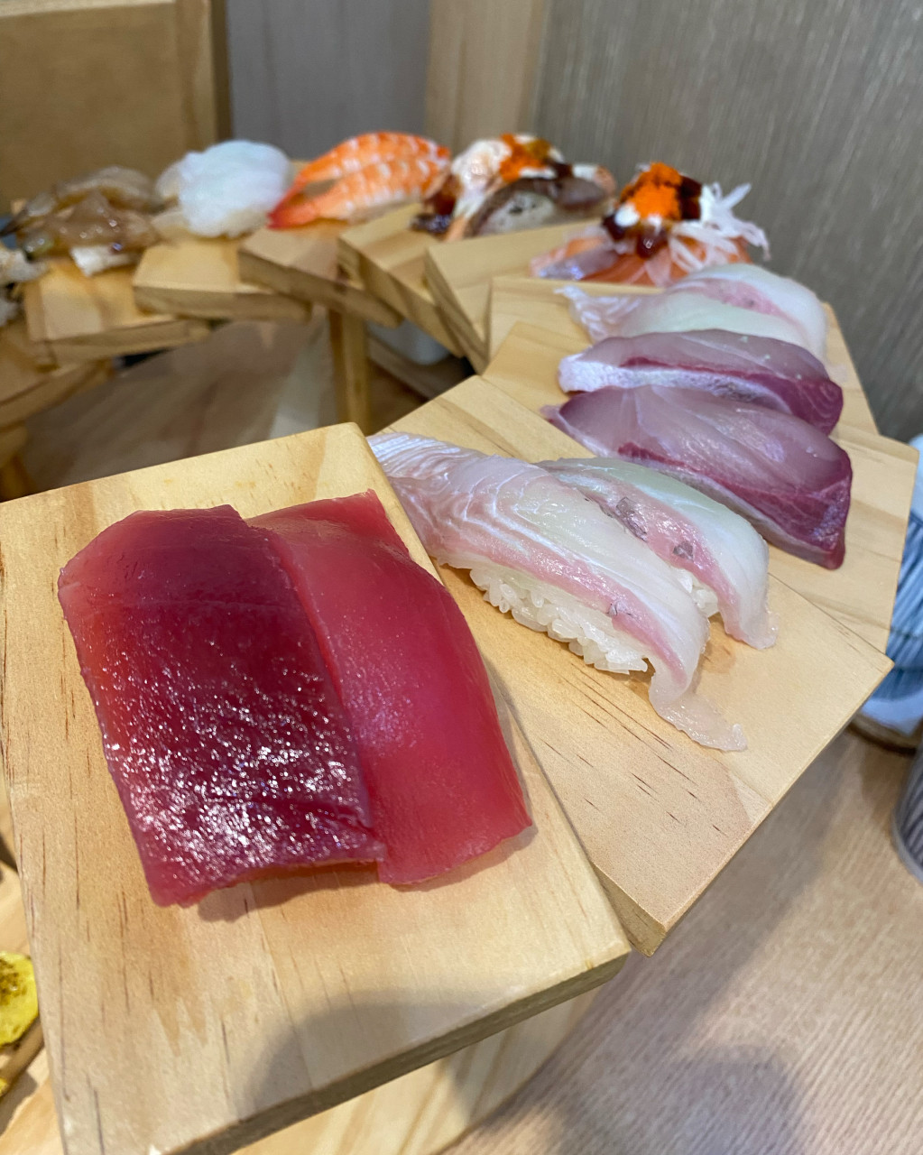 계단식 나무 받침대 위에 층층이 올려진 초밥들이 시각적인 재미를 제공하며,