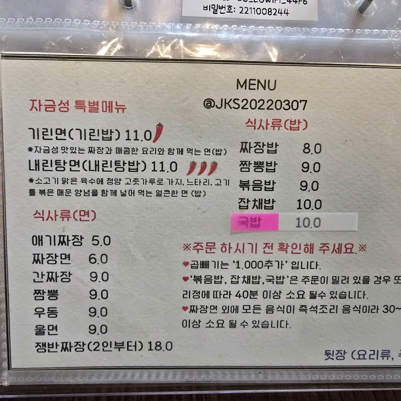 기린면과 내린탕면 등 특색 있는 메뉴,