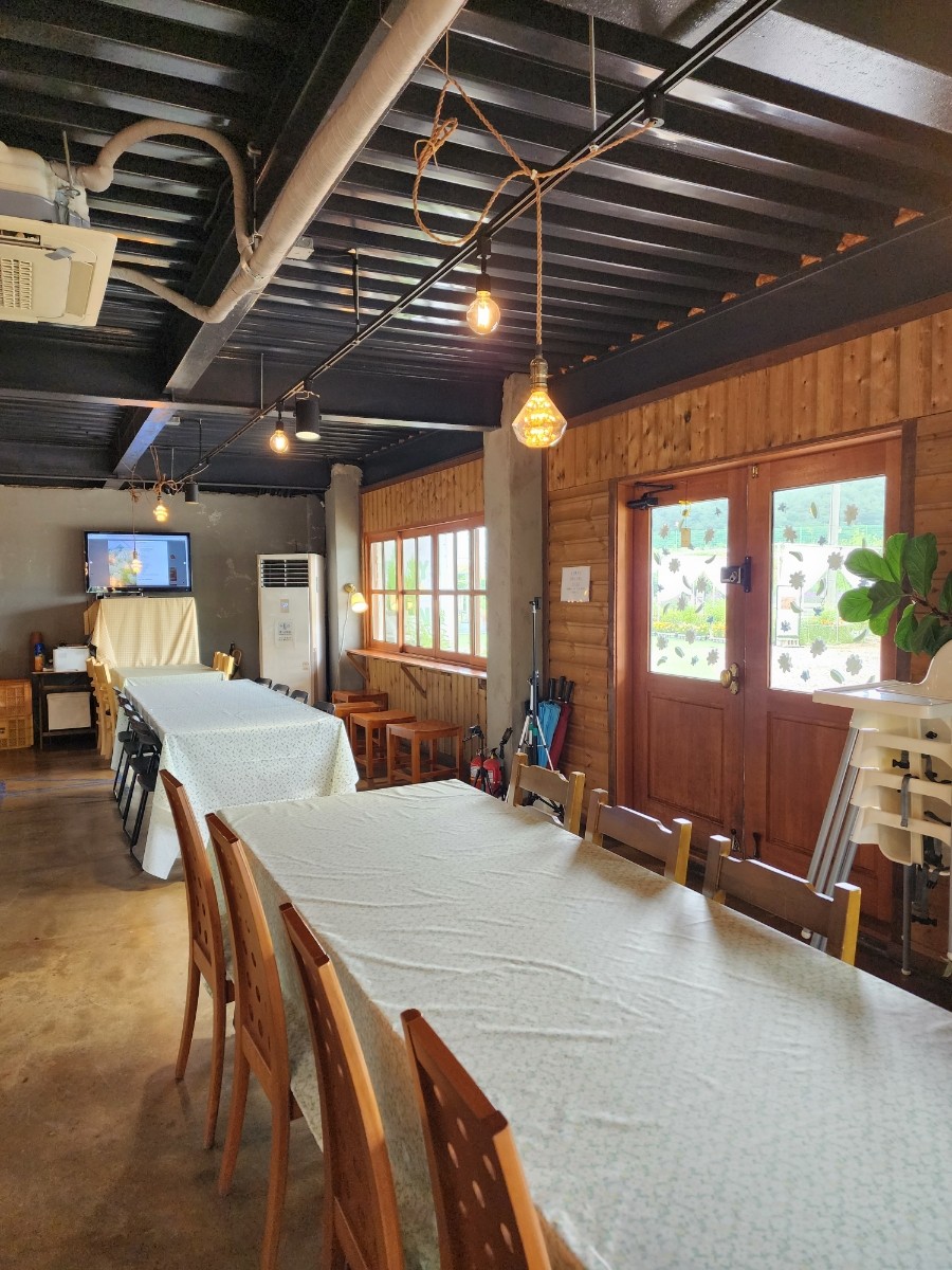카페 외부는 흰색과 나무가 조화를 이루는 소박한 농가 스타일 건물로,