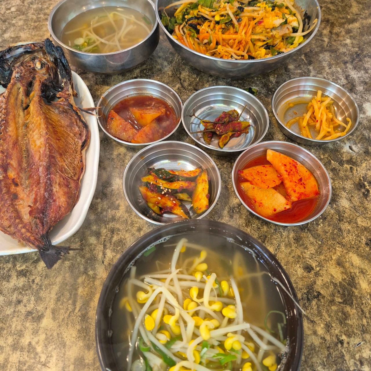 고등어구이 정식은 5,000원으로, 바삭하게 구운 노르웨이산 고등어와 흰쌀밥, 된장찌개, 반찬이 함께 나온다. 겉은 바삭하고 속은 촉촉해 고등어 본연의 고소한 맛을 즐길 수 있다.