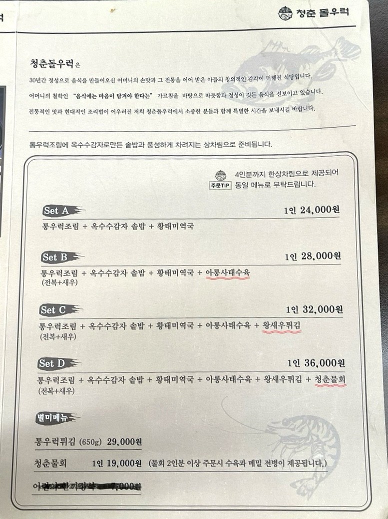 [2TV 생생정보 2376회] 9월 15일 월요일 취재 연락처.[고수의 부엌 ‘결정적 한 수’] <바다를 담은 푸짐한 한상, 통우럭조림> 안녕하세요! 오늘은 강릉 강문해변 근처에서 만난 숨은 맛집 청춘돌우럭을 소개해 드리려고 합니다. 강릉 여행 중 제대로 된 한식을 즐기고 싶으시다면 꼭 가보셔야 할 곳이에요. 특히 탁 트인 바다뷰와 함께 즐기는 우럭조림과 물회는 "여긴 진짜 강릉 맛집이다"라는 말이 절로 나옵니다. 직접 다녀온 솔직한 후기를 정리했으니 끝까지 읽어주세요.